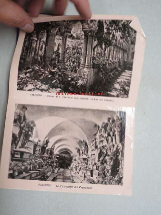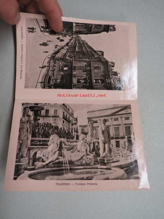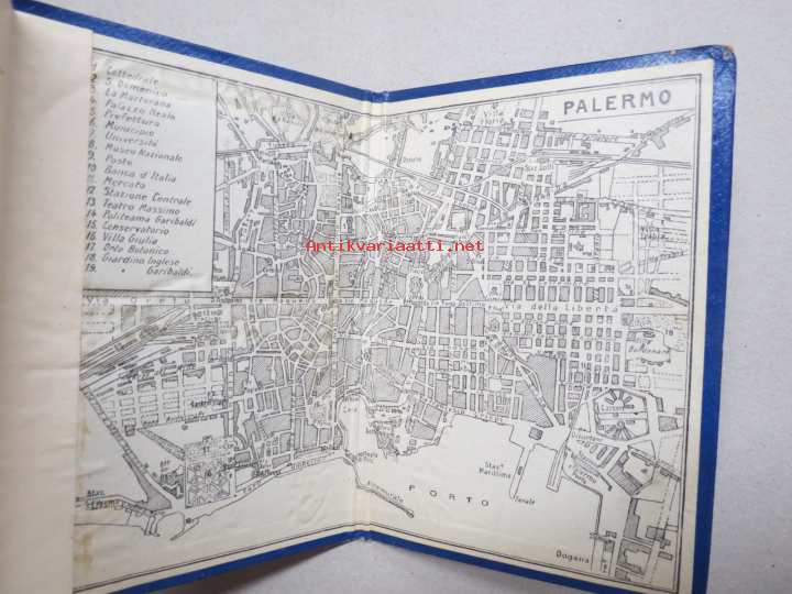 Ricordo Di Palermo -haitarimaisesti aukeava kuvateos kaupungista ja nähtävyyksistä, kartta, kohopainatteinen kansi, 1900-luvun alku (kuvissa ei vielä näy autoja)