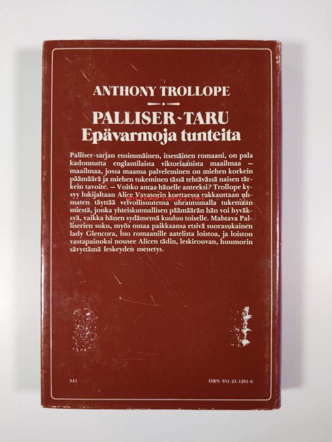 Koko nimi: Palliser-taru 1-8 : Epävarmoja tunteita ; Korkeita tavoitteita ; Toiveita ; Kunnian vuoksi ; Timanttien välkettä ; Salaisia juonia ; Liian suuri houkutus ; Murhasta syytettynäMerkinnät: ylivedetty omistajamerkintä