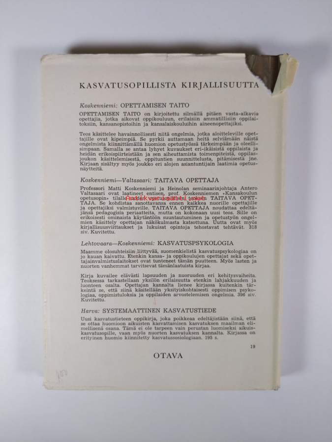 Hyvä. Tarkempi kuntoluokka: K3- ; Pientä kulumaa kansissa, muutamalla sivulla merkintää, selkämyksessä hieman vinoutta. Kansipaperin kunto: joitain repeämiä/kulumaa