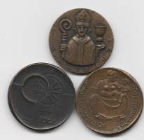 Helsingin Sanomien 75-vuotisjuhla: "Päivälehti 1889 – Ilta-Sanomat 1932 – Helsingin Sanomat 1904 – Sanoma Osakeyhtiö". Matti Haupt. 26 x 24 mm, 813 hopea L7/1964